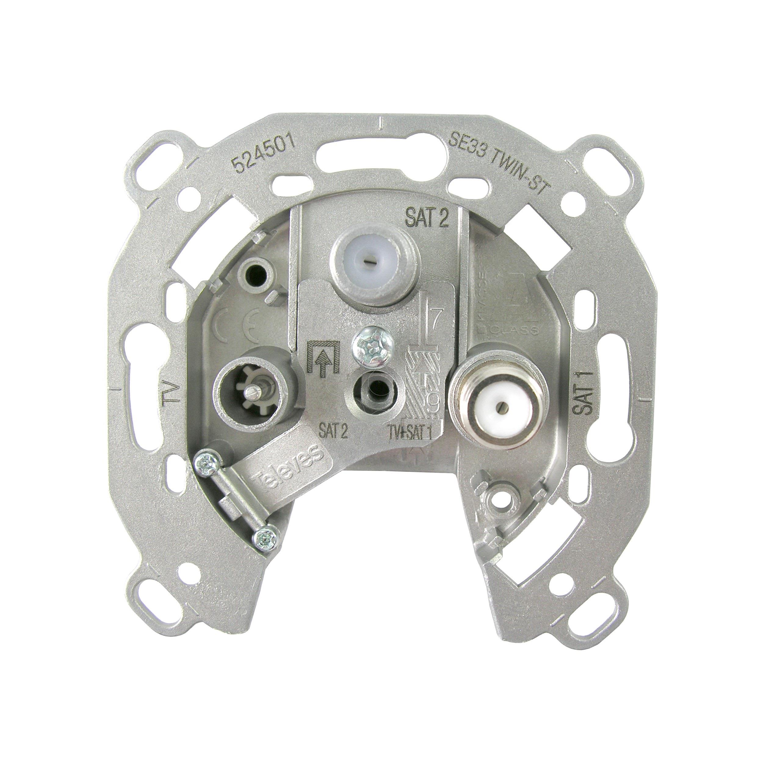 Tomada terminal 3 conectores: TV/FM-SAT1-SAT2. Tomada terminal 3 conectores: TV/FM-SAT1-SAT2. Tomada terminal de três conectores e 2 entradas. Munida de dois conectores F: O da parte inferior direita SAT1 para o sinal satélite da entrada 1 (filtrada), e o da parte superior SAT2 para o sinal satélite e terrestre da entrada 2 (toda a banda 5-2400MHz). Na parte inferior esquerda está o conector CEI macho para radio (FM) e TV terrestre, proveniente da entrada 1 da tomada.andnbsp, A parte inferior do chassi é aberta. . Filtro separador de grande rejeição entre terrestre e satélite: O sinal SAT é filtrado no conector CEI de FM/TV, e a FM/TV terrestre é filtrada no conector F de satélite SAT1.. Fabricação automatizada em linha robotizada. Elevado isolamento. Grande isolamento entre saídas.