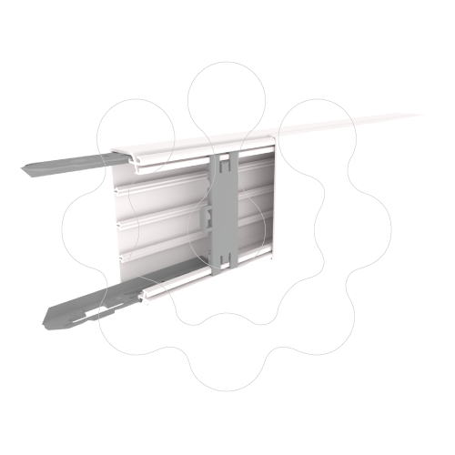 Calha Unex 40x110 em U23X. Perfil para distribuição de cabos com tampa exterior, apto para uso em intempérie. Tem compartimentação flexível para a condução e proteção de cabos elétricos e de comunicações. A base é perfurada a cada 250mm. Com a calha, é fornecida uma ponte a cada 0,5m e duas uniões. Estas peças vêm pré-montadas. Comprimento: 3m. Recomendadas ITED. Segurança: mecânica (proteção contra impactos IK10), elétrica (material isolante, IP4X montada na parede) e em caso de incêndio (ensaio do fio incandescente a 960 °C, não propagador da chama). A montagem da tampa realiza-se à pressão (não é necessário deslizar para montar). A ponte retém os cabos assegurando a fixação da tampa nos casos mais exigentes. As uniões unem mecanicamente os troços da calha garantindo a sua perfeita alienação, facilitando a montagem e fixação das bases sobre a superfície. Tanto a calha como os elementos de acabamento podem pintar-se. Separador móvel com montagem frontal. Cor: Branco.