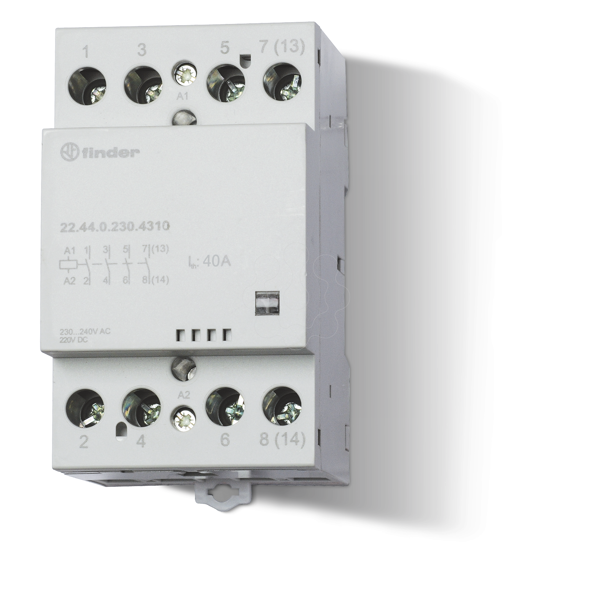 Contator modular 4NA Material dos contatos: AgSnO2 Tensão nominal de operação: 400 V. Carga máxima lâmpada incandescente: 4000 W. Carga máxima lâmpada fluorescente: 1500 VA. Tipo de tensão (tensão de excitação): AC/DC Tensão de excitação nominal: de 196 a 264 V. Tipo de tensão (tensão de operação): AC Corrente nominal de operação: 63 A. Possibilidade de equipamento adicional: sim Grau de proteção: IP 20 opcional: Indicador mecânico