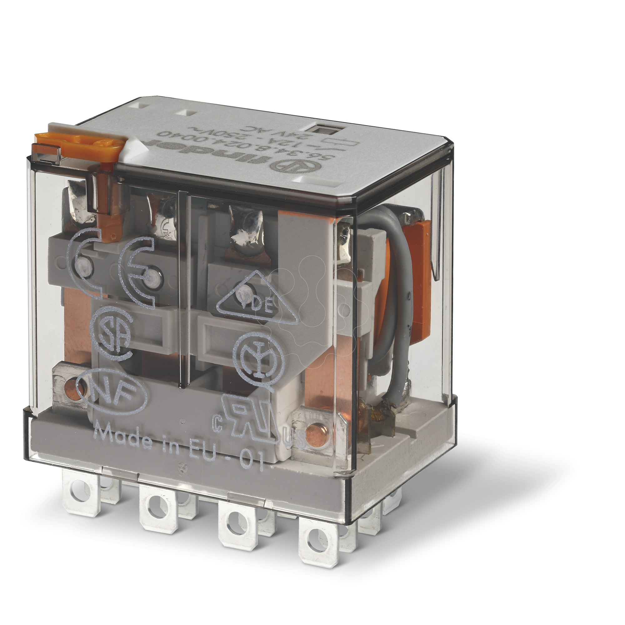 Relé de potência Corrente nominal: 12 A. Nr.contato: 4 Reversível Material dos contatos: AgNi Acabamento da conexão elétrica: Conexão por encaixe Tipo de tensão para atuação: AC Tensão de alimentação de corrente nominal de 50 Hz AC: 12 V. Acionador, polarização: Polaridade livre Acionador/comutação do inversor: Mono estável Categoria de proteção: RT I. Com indicação LED: sim acessórios: Base S.96