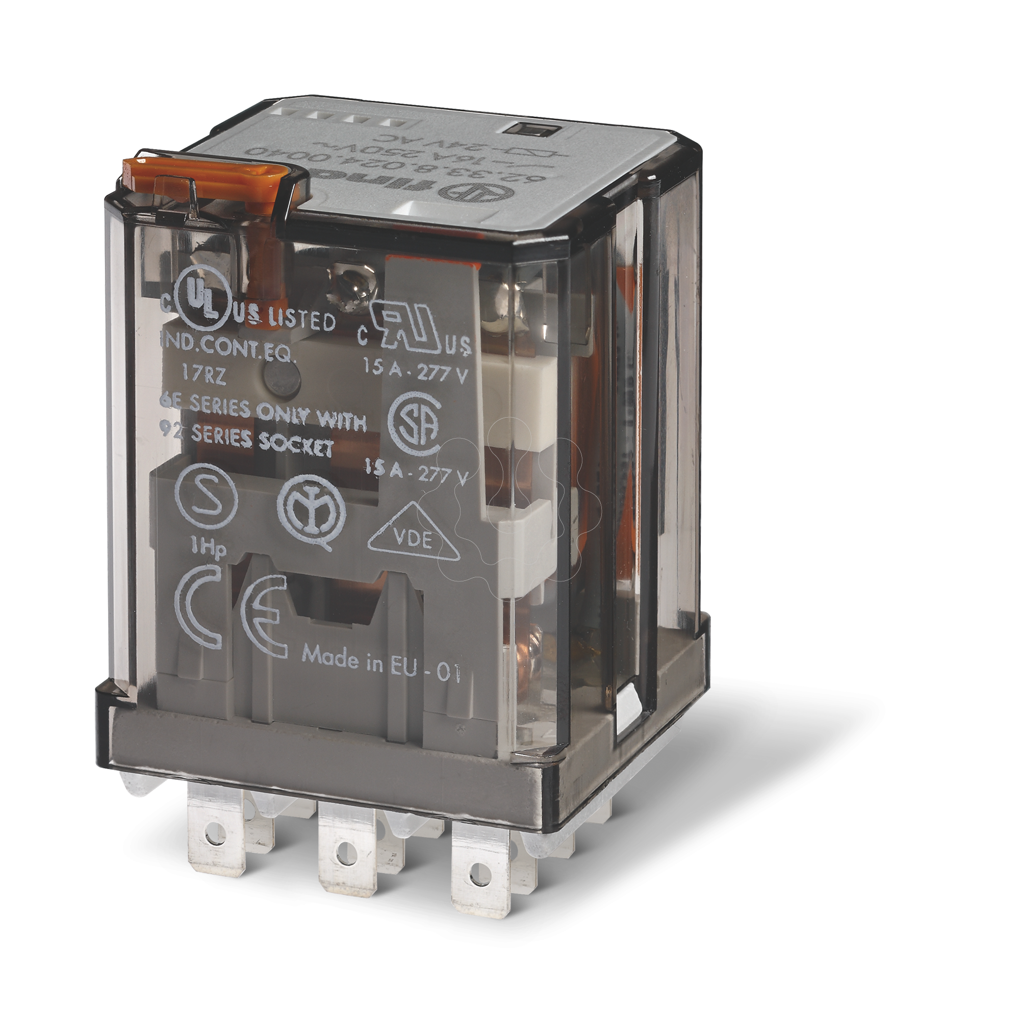 Relé de potência Corrente nominal: 16 A. Nr.contato: 3 Reversível Material dos contatos: AgCdO Acabamento da conexão elétrica: Conexão por encaixe Tipo de tensão para atuação: AC Tensão de alimentação de corrente nominal de 50 Hz AC: 12 V. Acionador, polarização: Polaridade livre Acionador/comutação do inversor: Mono estável Categoria de proteção: RT I. Com indicação LED: sim opcional: Botão de teste bloqueável+LED acessórios: Base S.92