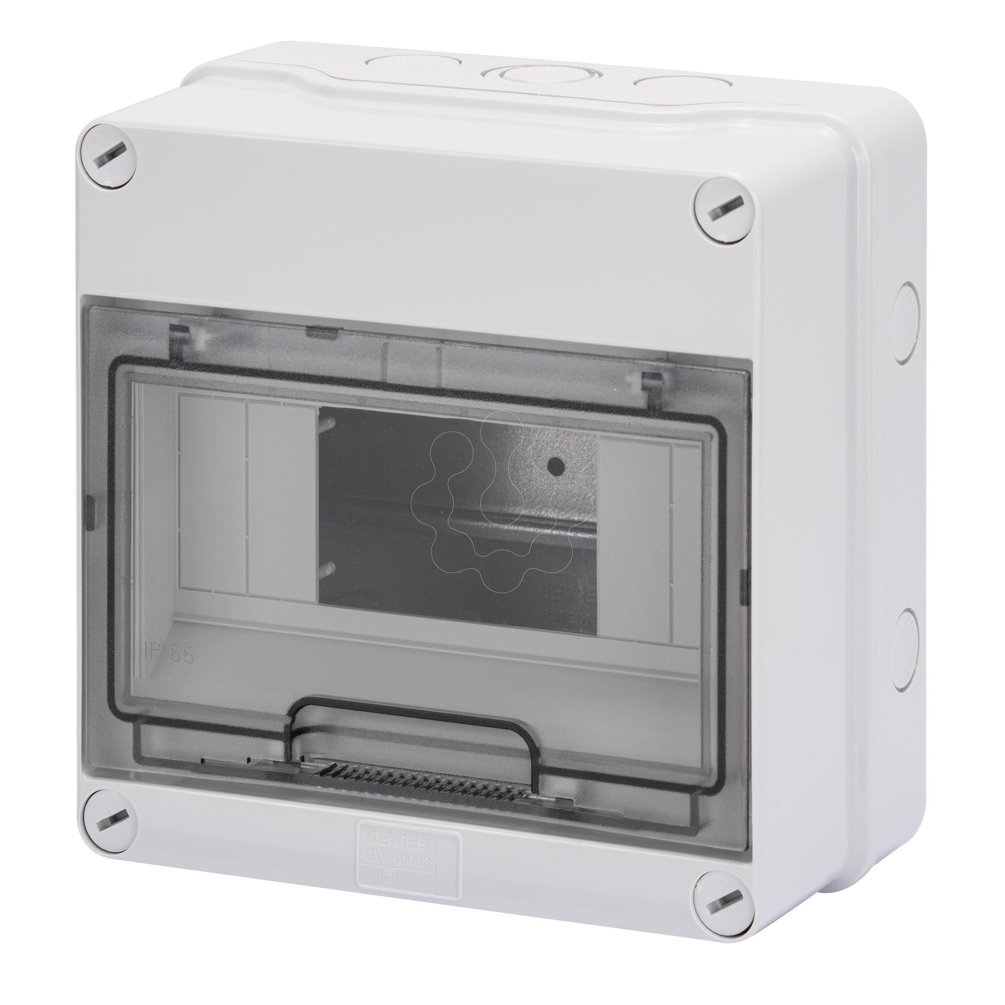 "Série 40 CD - Caixas e painéis de distribuição de montagem saliente - A série 40CD de painéis de distribuição de montagem saliente, disponível nas versões com porta transparente fumada ou cega e em tamanhos de 8 a 72 módulos, garante uma integração estética em todos os tipos de ambientes. A oferta inclui: 40CDK - IP65 - quadros estanques com caixilho amovível (a partir de 24M), painéis seláveis, acessíveis com condutas de cablagem, fechadura, tampas estéticas e painéis cegos