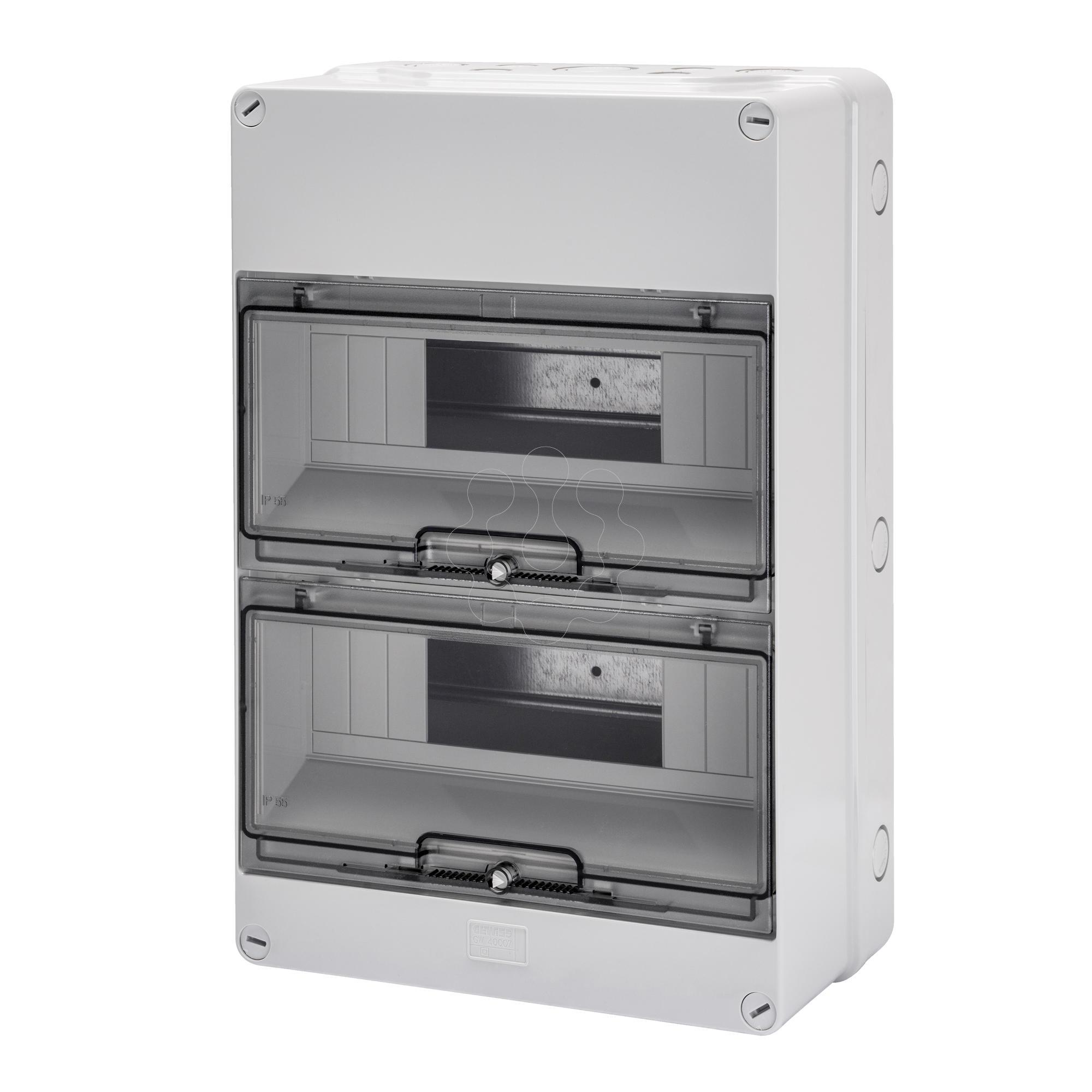 "Série 40 CD - Caixas e painéis de distribuição de montagem saliente - A série 40CD de painéis de distribuição de montagem saliente, disponível nas versões com porta transparente fumada ou cega e em tamanhos de 8 a 72 módulos, garante uma integração estética em todos os tipos de ambientes. A oferta inclui: 40CDK - IP65 - quadros estanques com caixilho amovível (a partir de 24M), painéis seláveis, acessíveis com condutas de cablagem, fechadura, tampas estéticas e painéis cegos