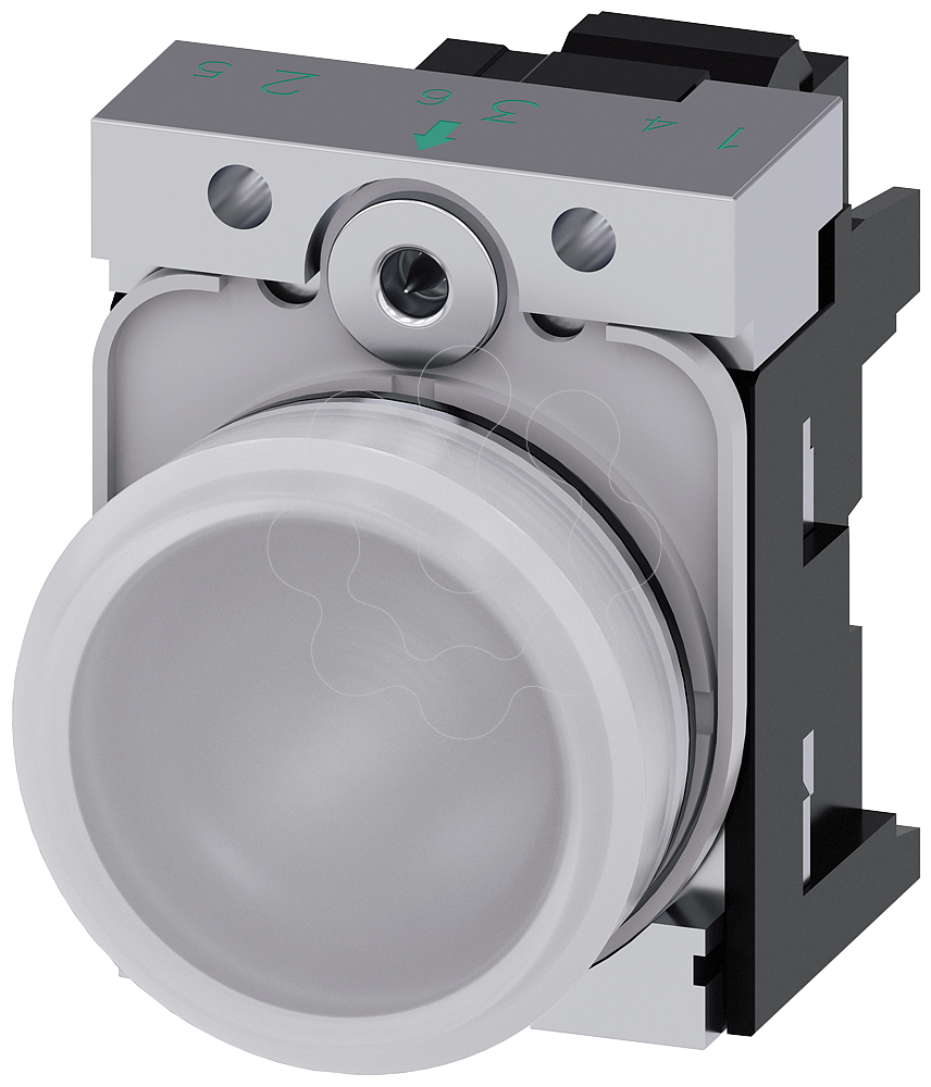 indicador luminoso, 22 mm, redondo, metal, de alto brilho, branco, lente, plano, com suporte, módulo LED com LED integrado 230 V CA, conexão de mol...