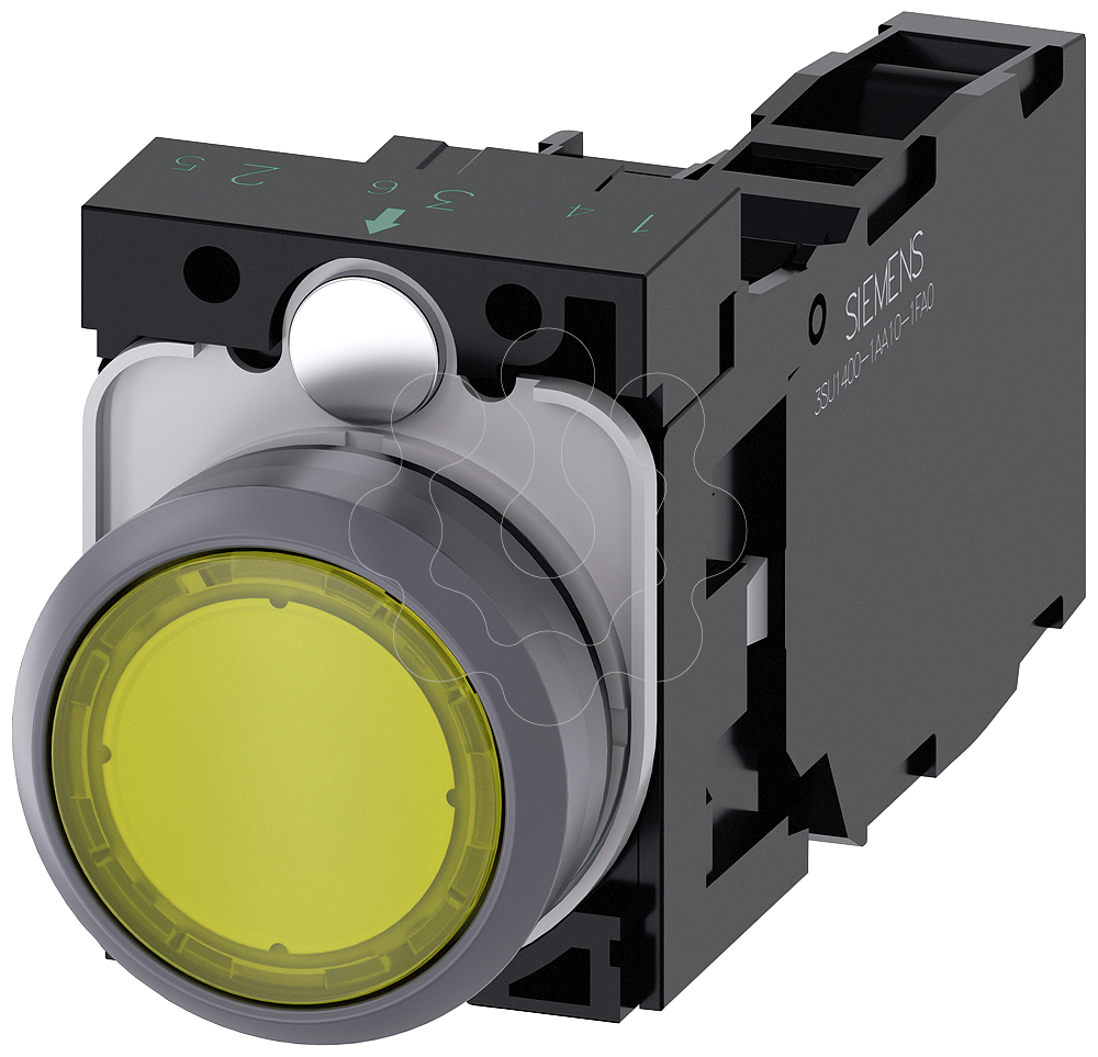 Botão iluminado, 22 mm, redondo, plástico com anel frontal metálico, amarelo, botão de pressão, plano, tecla com retorno, com suporte, 1NA+1NF, mód...
