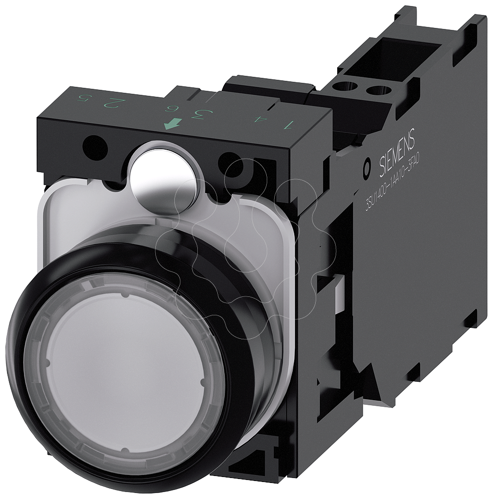 botão iluminado, 22 mm, redondo, plástico, transparente, botão de pressão, plano, tecla com retorno, com suporte, 1NA+1NF, módulo LED com LED integ...