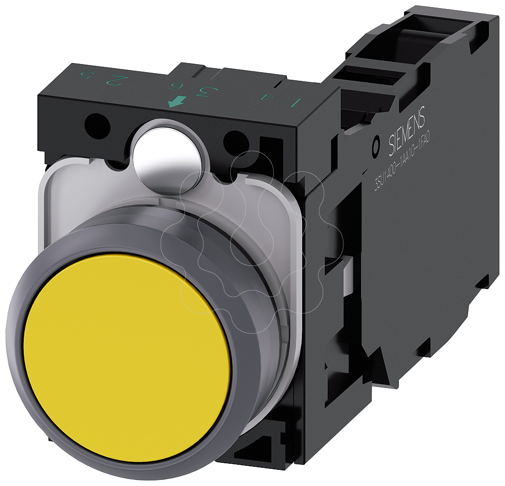 botão, 22 mm, redondo, plástico com anel frontal metálico, amarelo, botão de pressão, plano, tecla com retorno, com suporte, 1NA+1NF, conexão paraf...