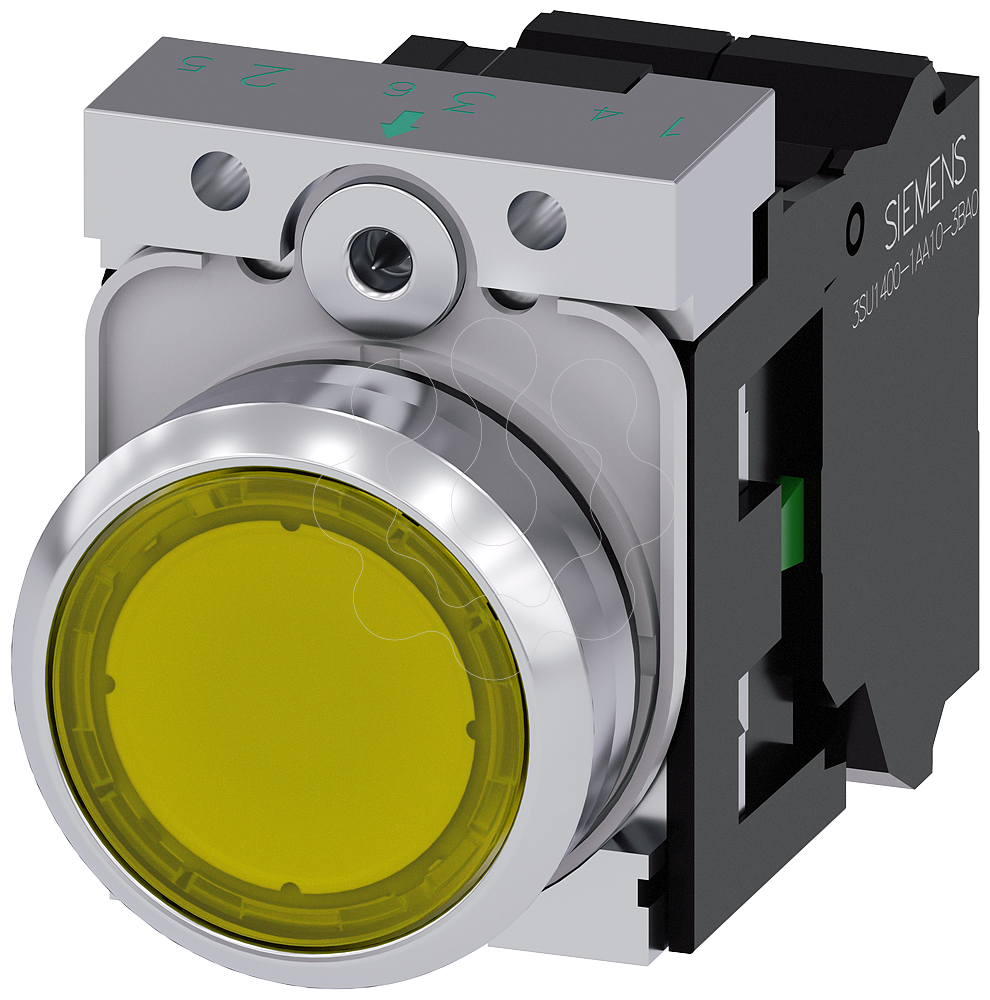 botão iluminado, 22 mm, redondo, metal, de alto brilho, amarelo, botão de pressão, plano, tecla com retorno, com suporte, 1NA, módulo LED com LED i...