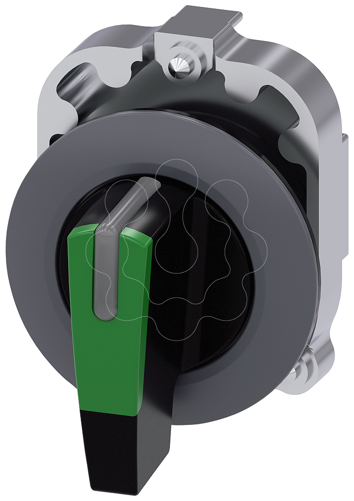 interruptor com manípulo, iluminável, 30 mm, redondo, metal, mate, verde, manípulo, comprido, anel frontal para montagem plana, 3 posições de comut...