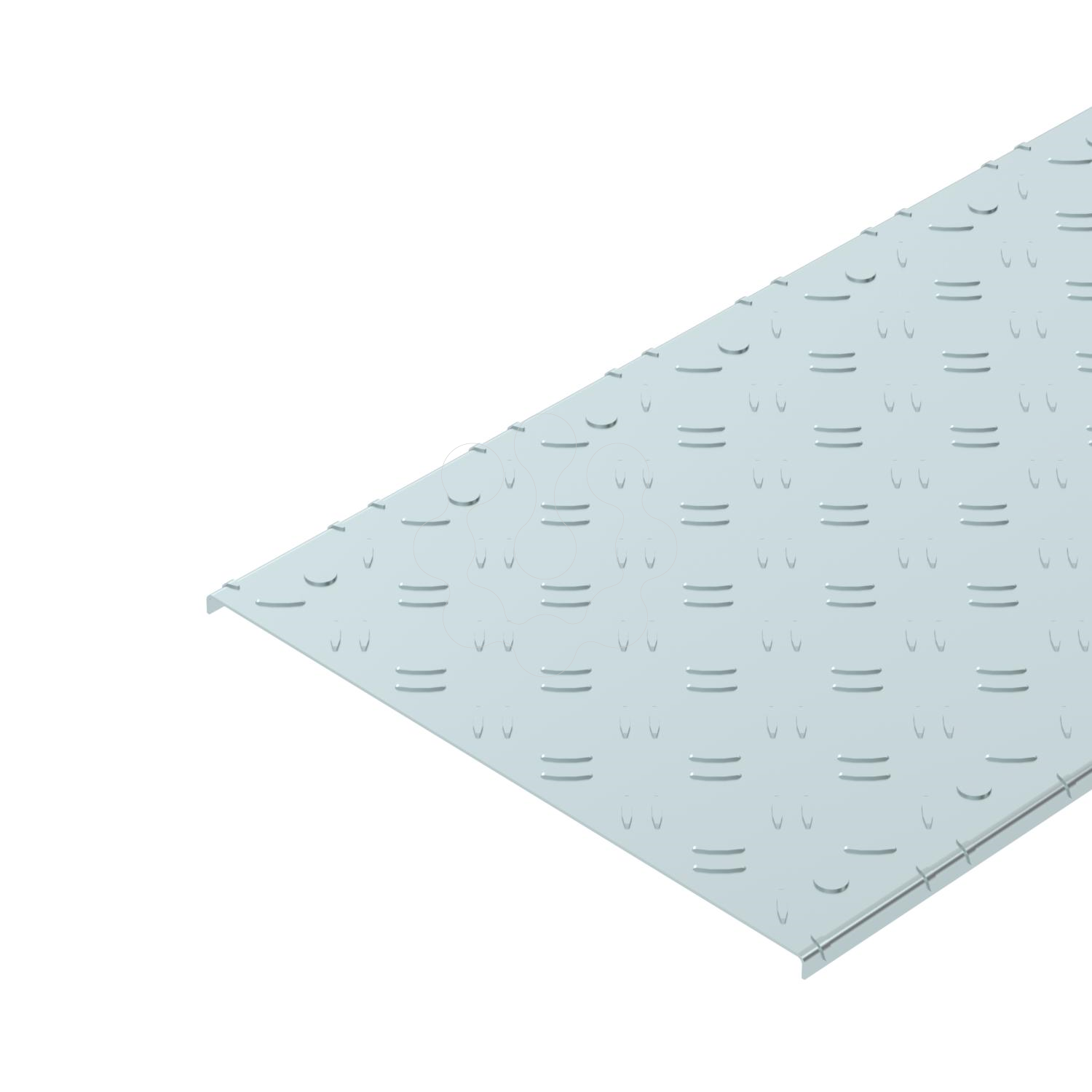 Tampa de chapa estriada para o caminhos de cabos do tipo BKR. A espessura da tampa é constituída por 2,0 mm de chapa de aço com galvanização contínua e 1,3 mm de altura de estriado. As aberturas de cabeamento a uma distância de 100 mm permitem a instalação posterior de um ferrolho.