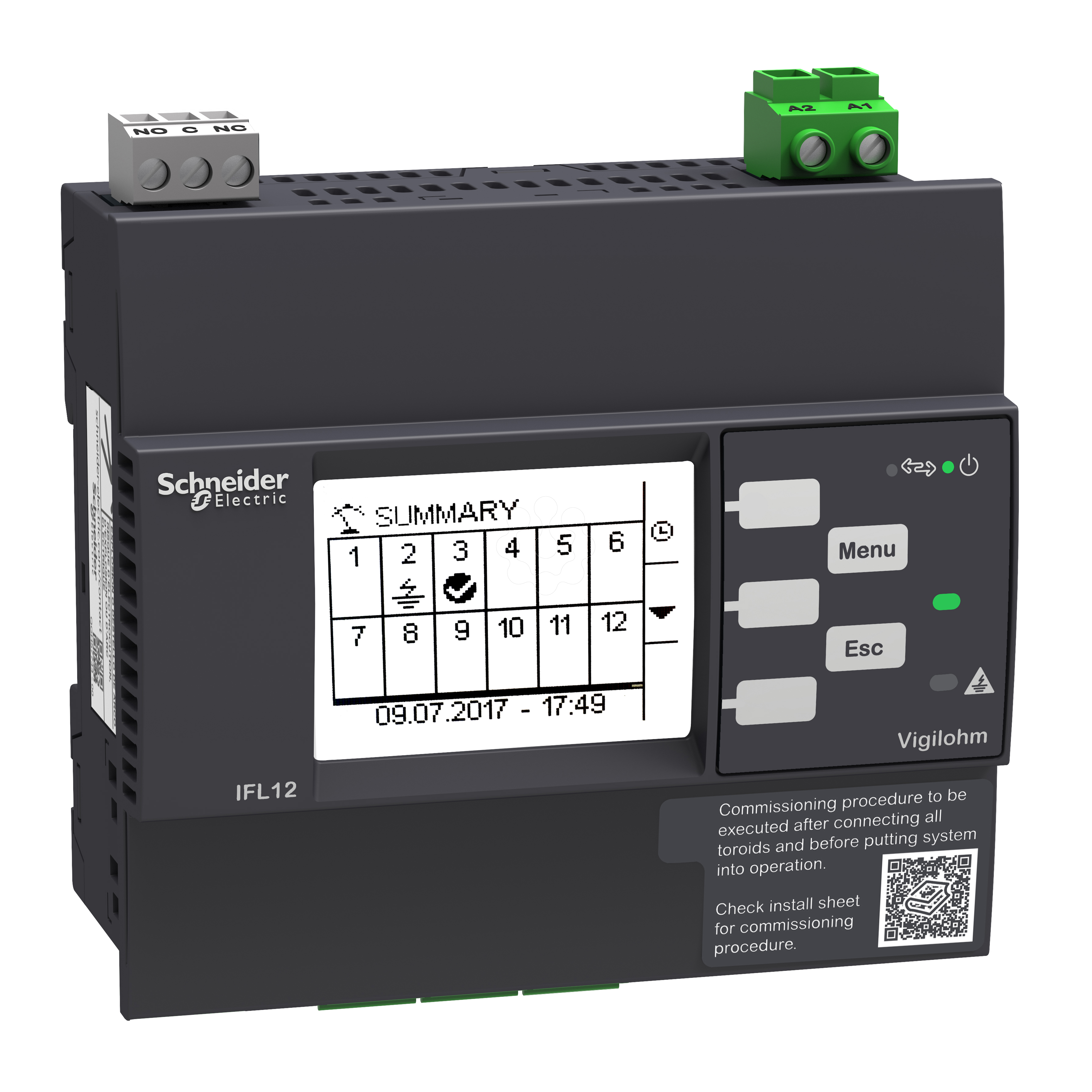 Este dispositivo pertence à gama Vigilohm projetado para monitorar redes elétricas não aterradas/IT ao nível do alimentador, de acordo com as normas de instalação e produtos Esta localização da falha de isolamento só é possível quando associada à série IM400, XM300 ou XM200. Este dispositivo é dedicado ao monitoramento de 12 alimentadores, AC, DC e ACDC, até o limite do toróide, 1000V. A configuração é feita pela parte frontal do dispositivo, pela tela da HMI ou pela porta de comunicação. As configurações estão relacionadas aos limites de alarme. Exibe qual alimentador está com falha de isolamento. O autoteste é iniciado automaticamente a cada 5 horas e sob demanda. "Caso a resistência de isolamento caia abaixo do limite definido, um alarme é acionado através do relé de saída IFL e da HMI." Uma vez que nenhuma falha é monitorada, o alarme é apagado, o relé de alarme volta ao normal. The device can be supplied by a 110VAC to 440VAC source or a 110VDC to 440VDC, all with a tolérence of plus or minus 15%.