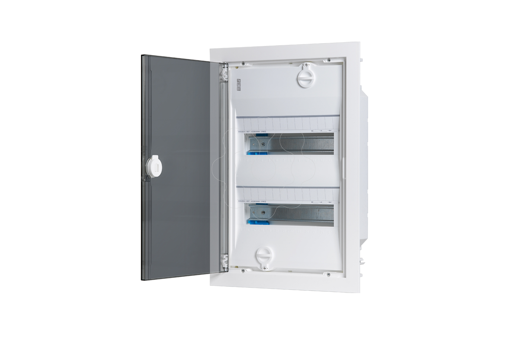 QDR DIST EMB PT TRP 2F 28M BRC. QUADRO DE DISTRIBUIÇÃO MONTAGEM EMBUTIDA PORTA TRANSPARENTE 2 FILAS 28 MÓDULOS B. Em conformidade com a norma EN 61439-3 Para montagem de embutir Fabricado em termoplástico Cor: branco RAL 9010 2 filas, 24 módulos Porta transparente, porta com aro reversível Instalação de equipamentos em calha DIN (35 mm) EN50022. Distância entre calhas 150mm Caracteristicas mecânicas: material poliestireno Tensão de isolamento 400V Humidade máxima (50%HR a + 40ªC) Classe II de isolamento IP41/IK07 Sem halogéneos Acessórios incluidos: Equipado com ligador T/N - Ref: SL16N16T Etiqueta para identificação do circuito Opção: Cor cinza RAL 7035 Ligador rápido fixconnect