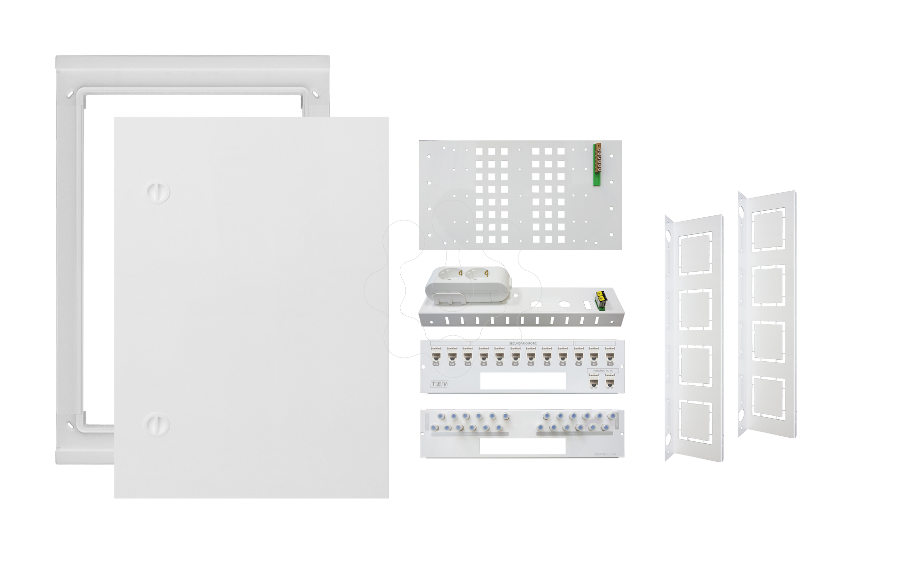 ATI M3 EMB REG P/ SAÍDAS 12PC 12CC 2FO BRC. KIT PAINÉL ATI MEGA M3 PARA MONTAGEM EMBUTIDA COM RÉGUA E COM 12 SAÍDAS PAR COBR. Em conformidade com as indicações 3.2.2.2 do manual ITED3 e as indicações 3.3.2.2 do manual ITED4 Para montagem de embutir Fabricado em termoplástico Cor: branco RAL 9010 Porta reversível a 180º. Ventilação por convecção natural. Fecho rotativo duplo. Possibilidade de colocar fechadura com chave - ref.MFC Possibilidade de aquisição do fundo ATI para instalação posterior Kits equipados com os RC PC categoria 6, RC CC 2400MHZ e RC FO SC/APC Classe II de isolamento IP40/IK07 Sem halogéneos