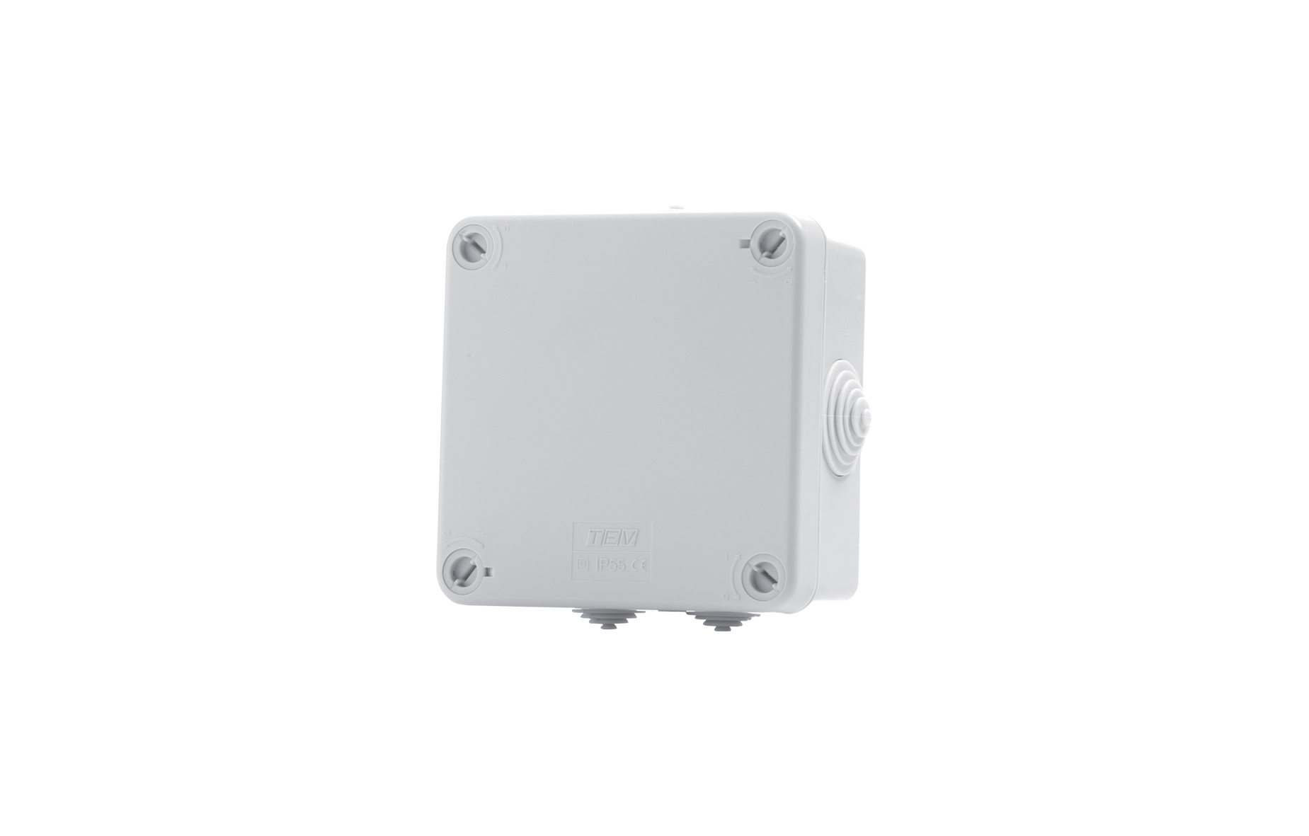 CAIXA DERIVAÇÃO SAL IP55 S100 CZT. CAIXA DE DERIVAÇÃO SALIENTE 116x116x60 IP55 CINZENTA. Em conformidade com a norma EN 60670-1 Para montagem saliente Fabricadas em material isolante termoplástico Cor cinzento RAL 7035 Tampa com aperto por parafuso com posicao 0/1 Inclui 5 entradas e 5 bucins cónicos (tipo SD25) Entradas/saidas: cabos flexiveis e tubos lisos Tensão de isolamento 500V Classe II de isolamento IP55/IK07 Sem halogéneos