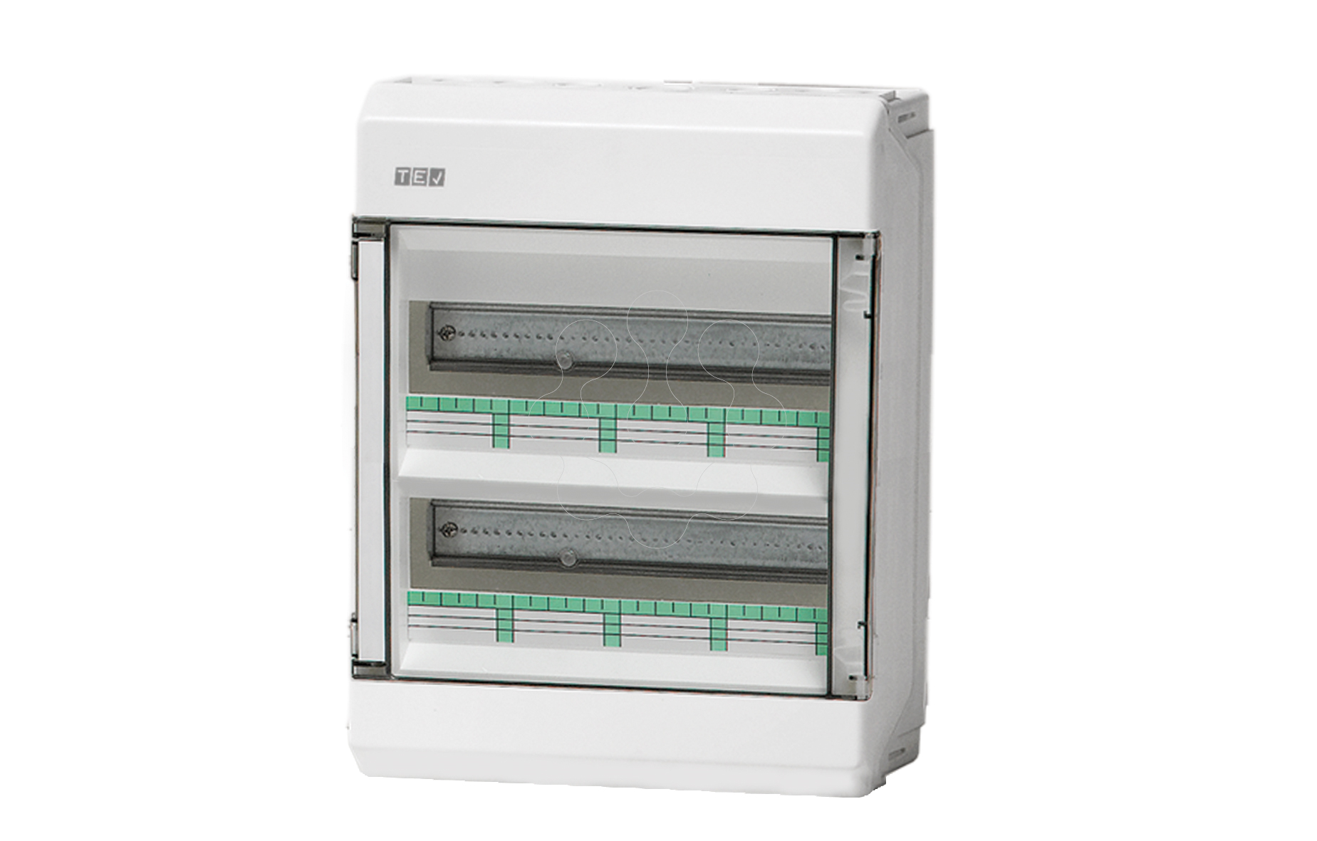 QDR DIST SAL SP PT TRP 2F 12M BRC. QUADRO DE DISTRIBUIÇÃO MONTAGEM SALIENTE PORTA TRANSPARENTE 2 FILAS 12 MÓDULOS B. Em conformidade com a norma EN 61439-3 Para montagem saliente Fabricados em termoplástico Cor: branco RAL 9010 Porta transparente, reversível e com abertura a 180º Instalação de equipamentos em calha (35 mm) EN50022 Espaço de 20 mm entre calha e o fundo da caixa para passagem de cabos Com entradas métricas pré-marcadas Características mecânicas: material poliestireno Tensão de isolamento 400V. Tensão nominal AC 230/400V. Humidade máxima (50%HR a + 40ªC) Classe II de isolamento IP40/IK07 Sem halogéneos Acessórios incluídos: Equipado com ligador T/N, Ref.:SL16N16T Etiqueta para identificação do circuito Opção: Cor cinza RAL 7035 Ligador rápido fixconnect