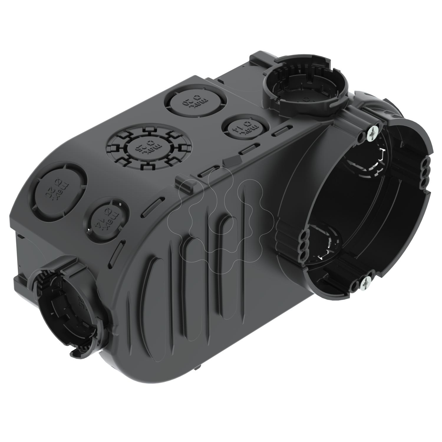 Caixa de eletrónica de encastrar com espaço de ligação adicional, para utilização em alvenaria com uma profundidade de instalação de pelo menos 66 mm. • Com 4 uniões de ligação acopláveis com fecho de baioneta • 6 entradas de tubos combinadas até Ø 20 e 25 mm • 8 entradas até Ø 20 mm • 6 entradas até Ø 14 mm • 2 entradas até Ø 20 mm na base • Separador para diferentes tensões, com aberturas de quebra • 4 x 3 cúpulas de parafuso