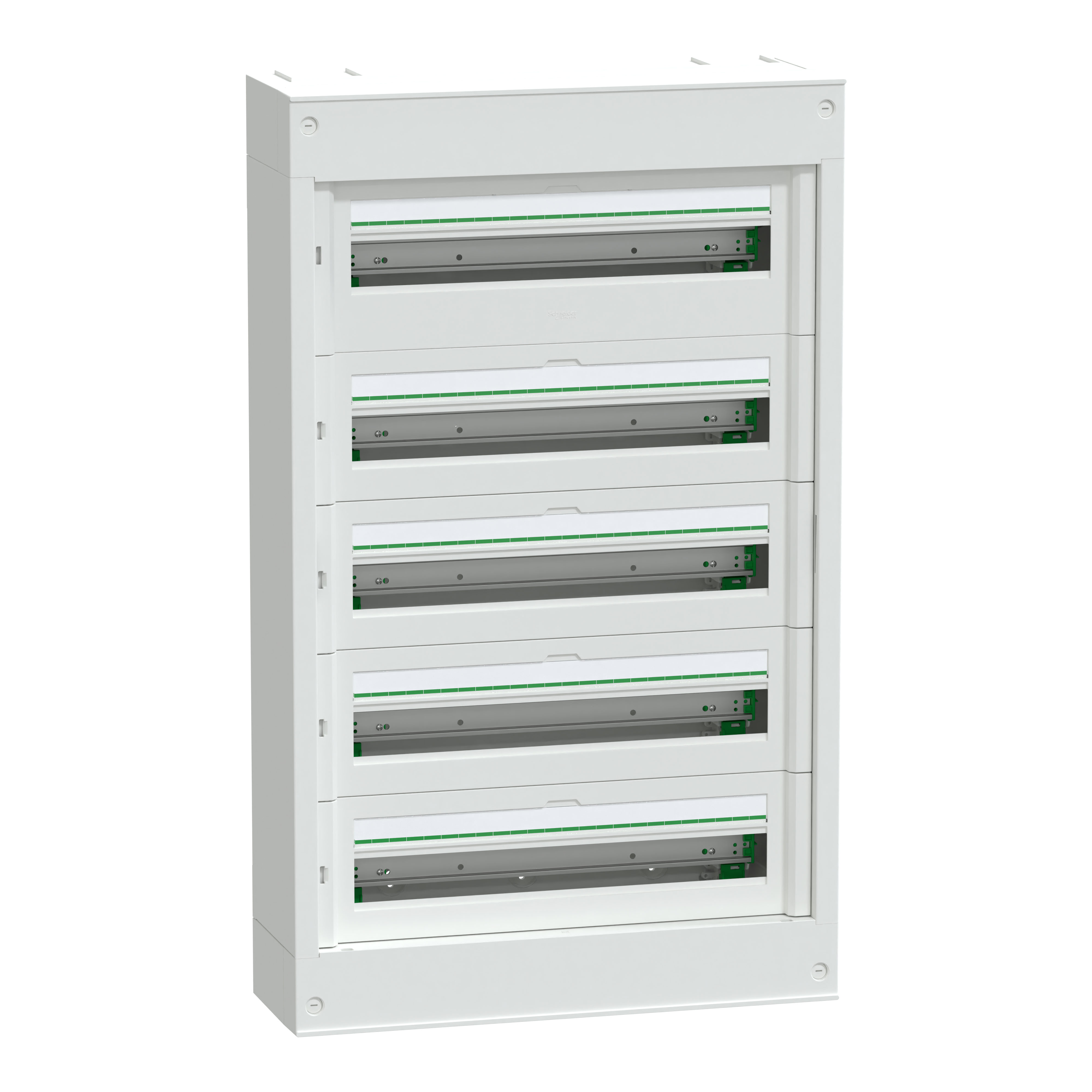 O PrismaSeT S é um quadro de distribuição de baixa tensão saliente de 120 módulos Este quadro de metal e plástico é composto por 5 filas de 24 módulos de 18mm Pode acomodar todo o tipo de dispositivos de protecção e controlo mudolar Dispõe de um espaço maior, na primeira fila, para comportar um disjuntor/interruptor NSXm 160 Equipado com um módulo de proteção diferencial, no caso de ser necessário Destinado à instalação em interiores nos setores residencial e comercial Concebido para electricistas, proporcionando ergonomia e flexibilidade na hora de instalar Os cabos podem entrar pela parte superior ou inferior do quadro, através de placas de entrada de cabos amovíveis Permite a entrada por cabo, tubo ou calha Apresenta um grau de proteção IP41, IK09 com porta e um grau de proteção IP30, IK08 sem porta Pode-se instalar uma porta opcional A parte frontal do quadro é branca (RAL 9003) Equipado com 4 calhas assimétricas removíveis, que facilitam cablagem e manutenção do quadro Com 1 bloco de terminais, proporciona 48 saídas (6x25mm² + 42x4mm²) Também pode alojar um distribuidor Acti9 VDIS Equipado com 4 protetores de etiquetas, 3 clipes de cabo, 4 placas modulares e 4 placas de obturação Apresenta uma classe de isolamento elétrico II A sua tensão nominal de isolamento Ui é de 400 V, com uma corrente nominal In de 160A Categoria de sobretensão II Compre com as normas IEC 61439-1 e 3 As dimensões são: 570 mm (largura) x 958 mm (altura) x 191 mm (profundidade) O invólucro é feito de metal e a parte frontal é de material tecnoplástico A sua resistência a incêndios é de 750°C para a parte frontal A sua temperatura de funcionamento é entre -25…60 °C