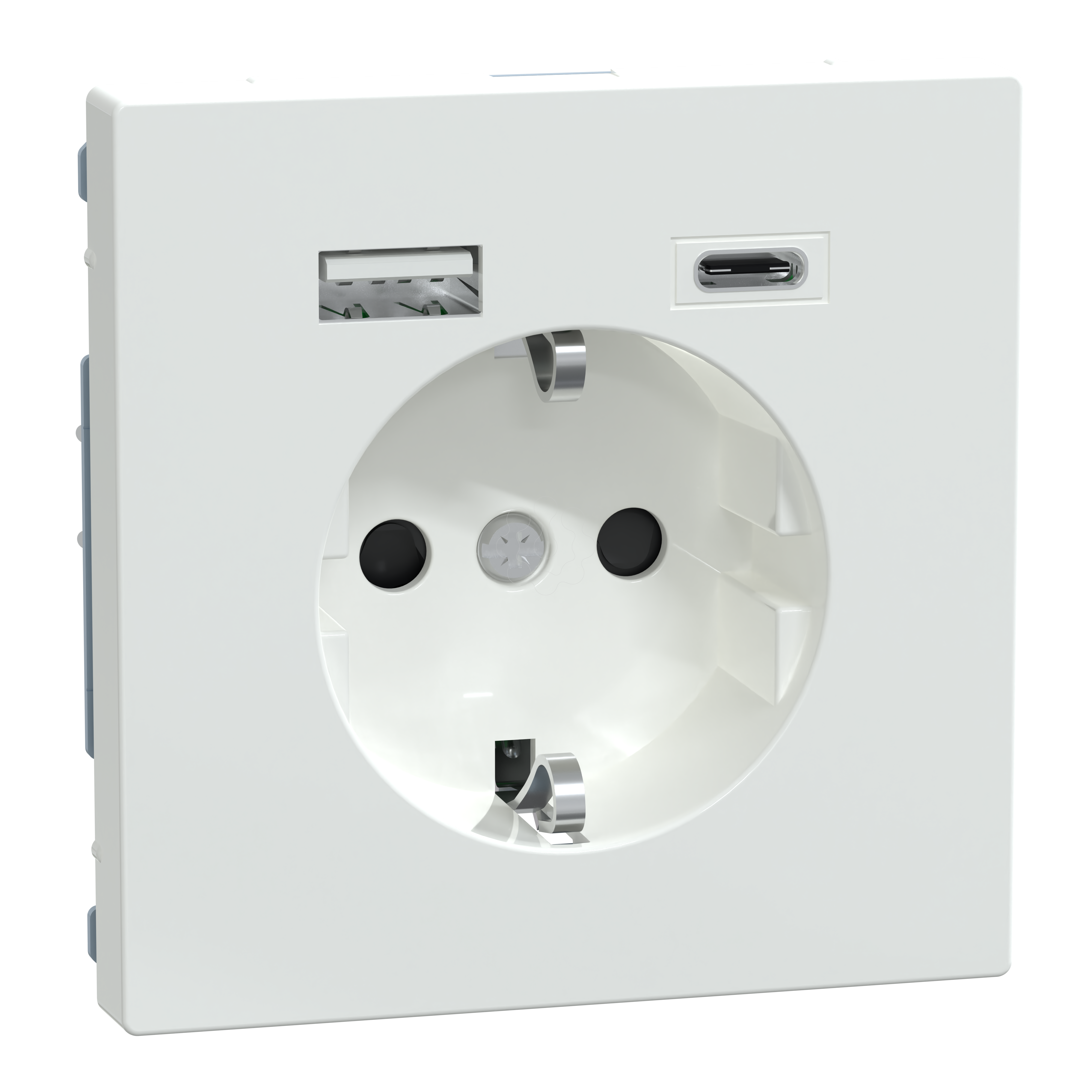 Schneider Electric Merten Carregador USB + tomada MTN2367-6035 na cor branca. Terminais de ligação rápida no carregador e na tomada. Com terra. Conector USB tipo A, USB tipo C, tomada de corrente. Standard Schuko. 73 mm de largura, 71 mm de altura, 44 mm de profundidade, com profundidade encastrada de 32 mm. Tomada de corrente 2P+T. O carregador USB+tomada, é feito de material ABS+PC, sendo o mais resistente possível. Proteção IP20. Certificados FIMKO, KEMA-KEUR, NEMKO, OVE, SEMKO, VDE . Conforme as normas IEC 60884-1, IEC 62368-1, IEC/EN 61558-2, SFS 5610, SS 428 08 34.